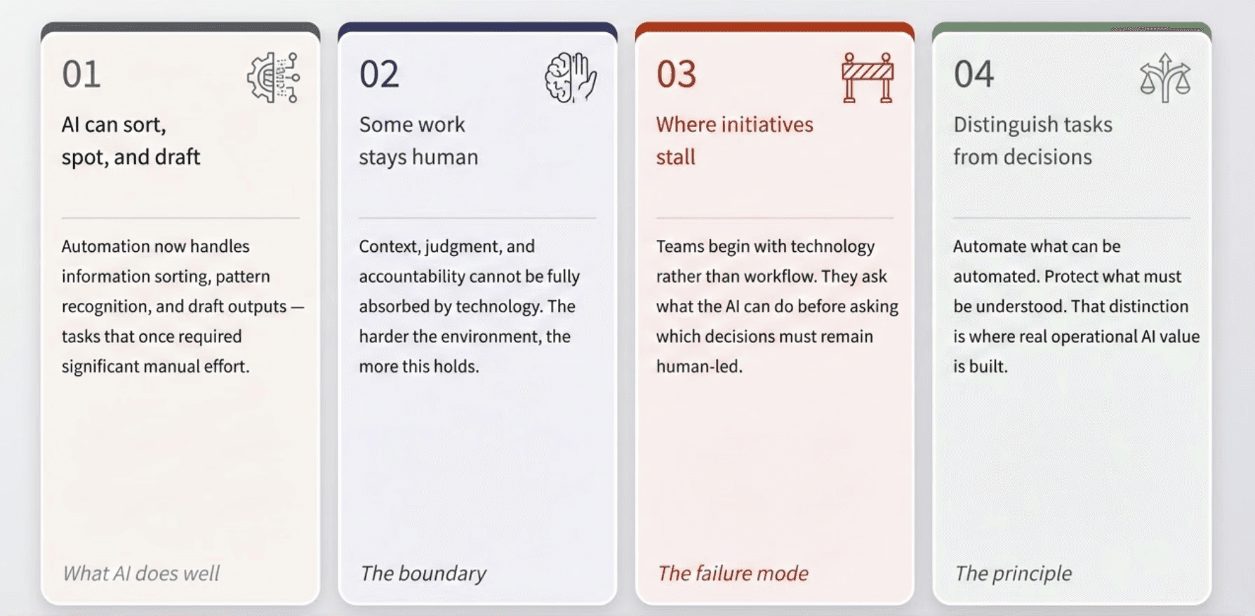 For leaders, the practical question is not whether AI can do more over time. It clearly can. The question is where it should be used now, under what conditions, and with what safeguards. That is how AI moves from experimentation to operational value: not by claiming every human skill can be automated, but by respecting the ones that still cannot.