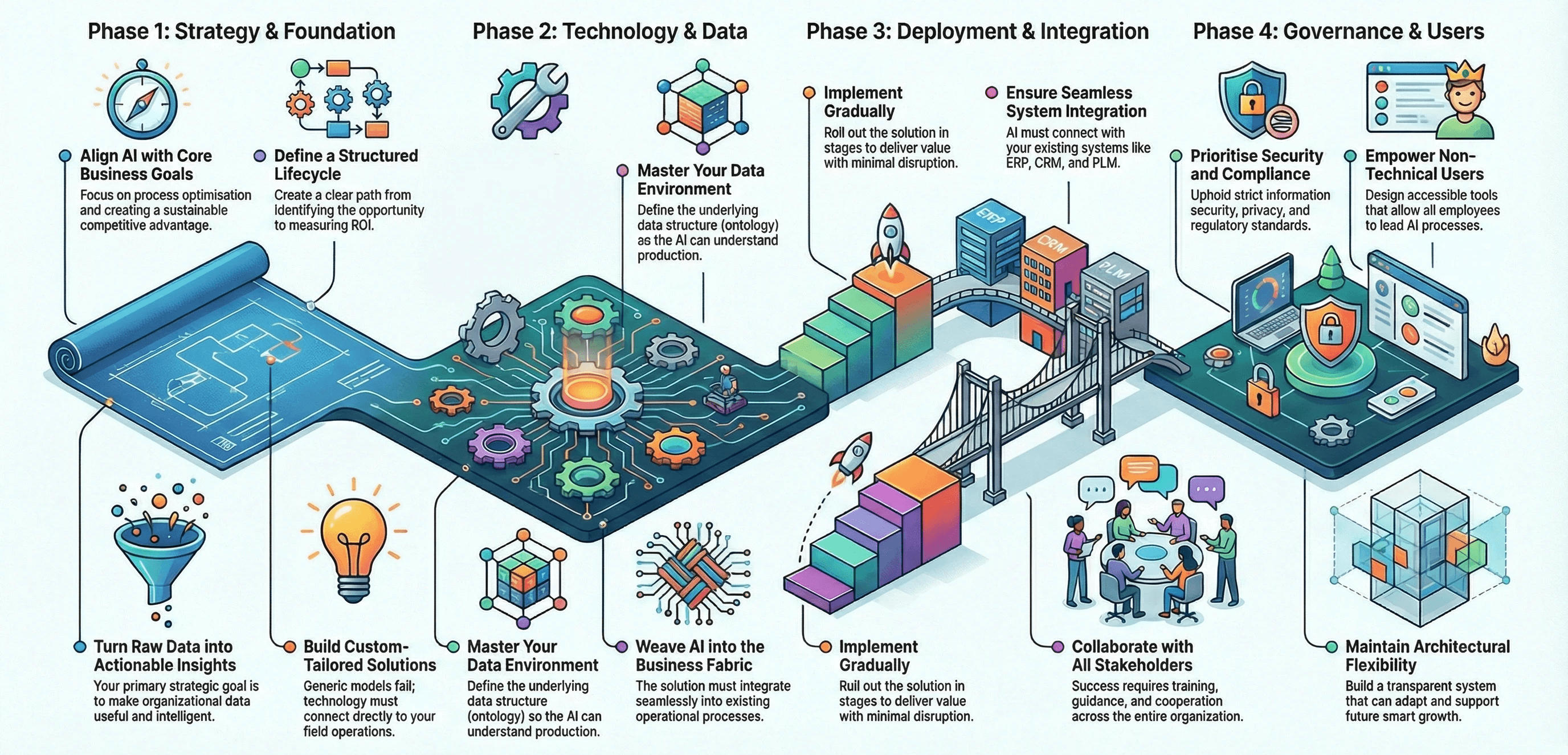 Smart integration of AI/ML/CAD into business processes, phased implementation with real value and minimal disruption.